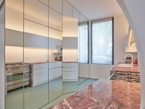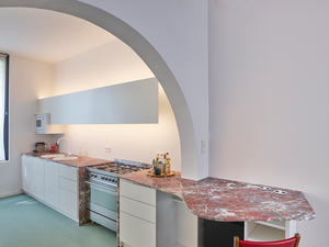 In this small space, Tine Loncin created enough room for a kitchen with storage by integrating a mirror cabinet. It makes the room look more spacious, doubles the amount of incoming daylight and provides space to store all the kitchen utensils. Since the residents wanted to keep the bright green floor, Tine looked for and found a suitable counterbalance in a red marble worktop. In the transition to the adjacent dining room the kitchen worktop changes into a larger, rounded worktop. Furthermore, by concealing the extractor hood, the shelves and kitchen lighting behind a long, suspended board in the same colour as the wall, an optical atmosphere of tranquillity and space is created.