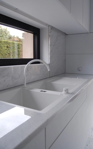 De eengezinswoning (bouwjaar 1970) was toe aan een grondige renovatie. De opdracht was om het gelijkvloers te verbinden met de garage in de tuin, via een bestaande luifel, om de functie van de woning te optimaliseren. De garage deed namelijk dienst als bergruimte, wasruimte en bijkeuken.