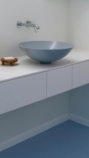 Met een minimum aan ingrepen het ruimtelijke potentieel versterken: het is een terugkerend element in het portfolio van Tine Loncin. Zo kreeg in dit project het bestaande, gebogen muurtje in de leefruimte weerklank door de ronding door te trekken via de blauwe gietvloer tot in de rest van het appartement. De keuze voor lichtblauw refereert aan het bouwjaar van de flat. Zo wordt met een knipoog naar de jaren zestig het appartement nieuw leven ingeblazen.