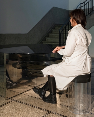 Stool _Kruk, bijzettafel, sokkel Twee transparante cilinders.Eén draagt de foam zitting, één houdt ze vast. (Foto’s ©Kaatje Verschoren) _PREVIOUS terug naar overzicht NEXT_